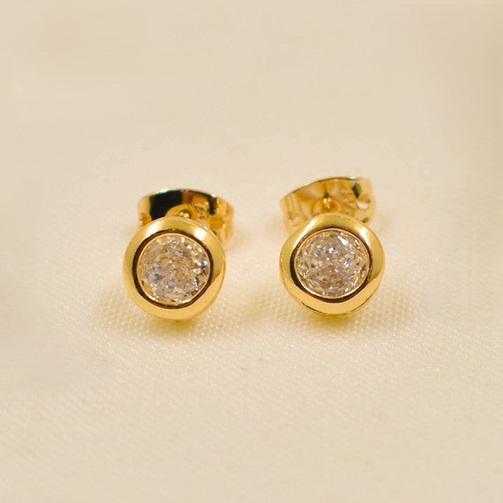 Enhance your elegance with our Serene Shine Studs. Each stud features a 0.6 cm round transparent zirconia, brilliantly set in a golden rhodium surround. These studs offer a refined sparkle and timeless charm, providing a sophisticated touch to any ensemble. Perfect for those who appreciate understated beauty, the Serene Shine Studs deliver a gentle yet radiant glow, embodying tranquility and grace in every wear.