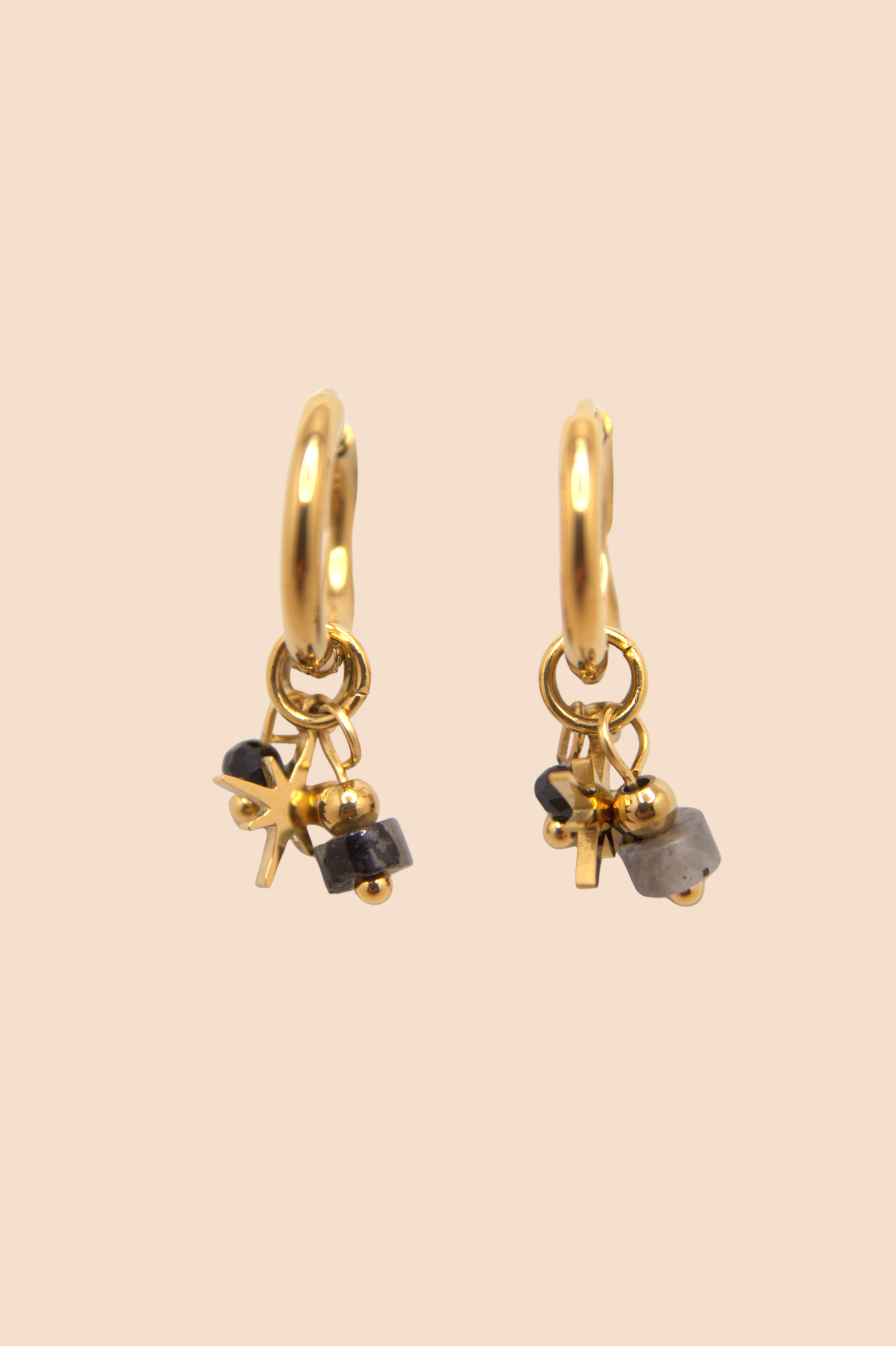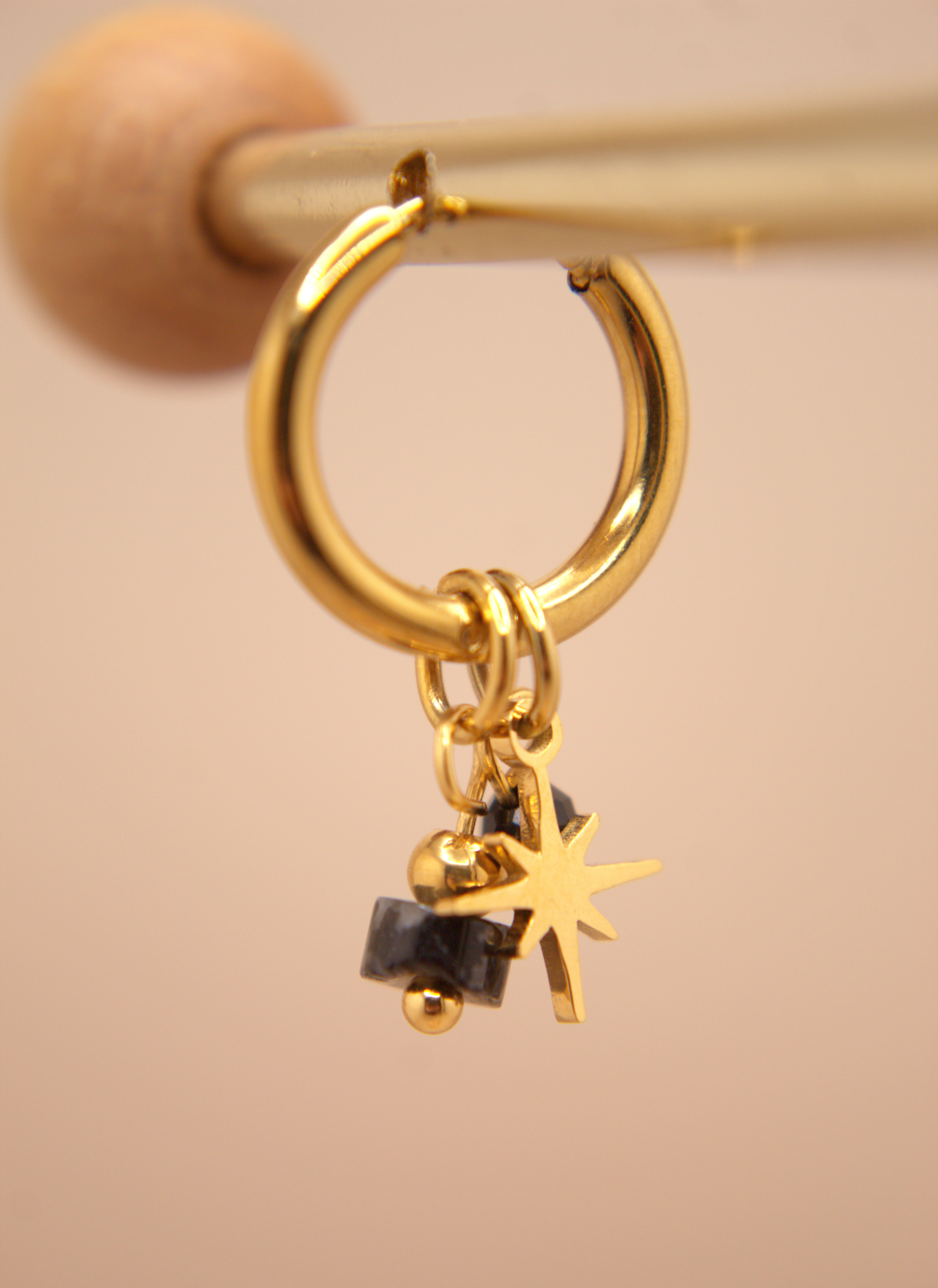 Our Stellar Guide Hoops are tiny cosmic talismans that combine the grounding energy of a deep gray stone with the radiance of an eight-pointed golden star.
